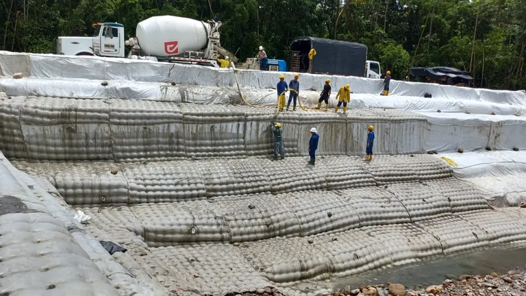 Formaleta flexible en tela sintética de doble capa, unida por puntos de filtración, entretejidos que se fabrican con fibras de nylon o poliéster de alta tenacidad. Al llenarse con concreto (se recomienda usar piedra con tamaño 3/8”) o mortero fluido, con el fin de garantizar una pantalla de espesor adecuada (en promedio 10cm); Se convierte en una solución práctica y económica para el revestimiento y control de erosión, puede ser instalada en ambientes secos o húmedos.